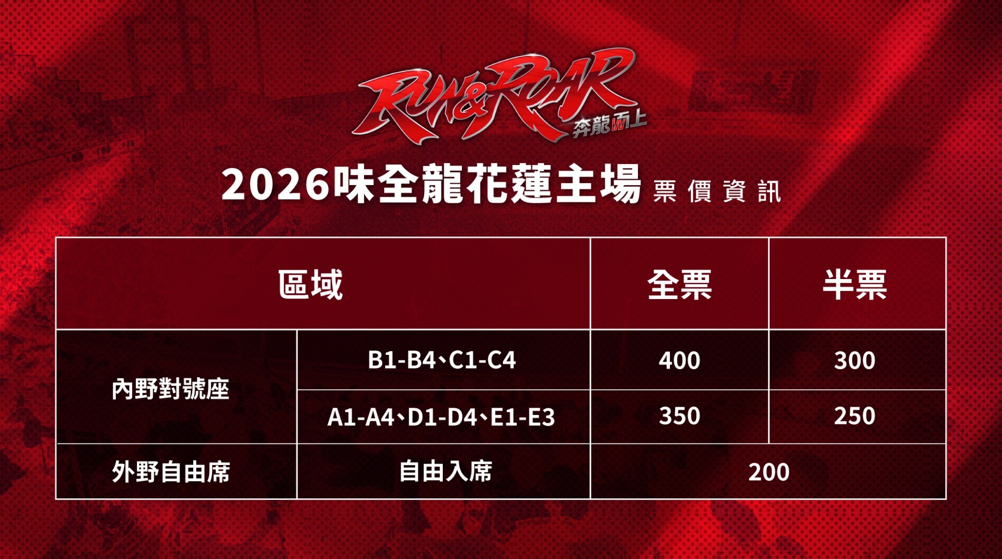 ✦ 天母場次 4/5(日)、4/6(一)、4/19(日)、5/3(日)、5/17(日)、5/31(日)、6/14(日)、7/5(日)、8/30(日)、9/13(日)、9/27(日),開賽時間16:05、售票時間/進場時間14:00